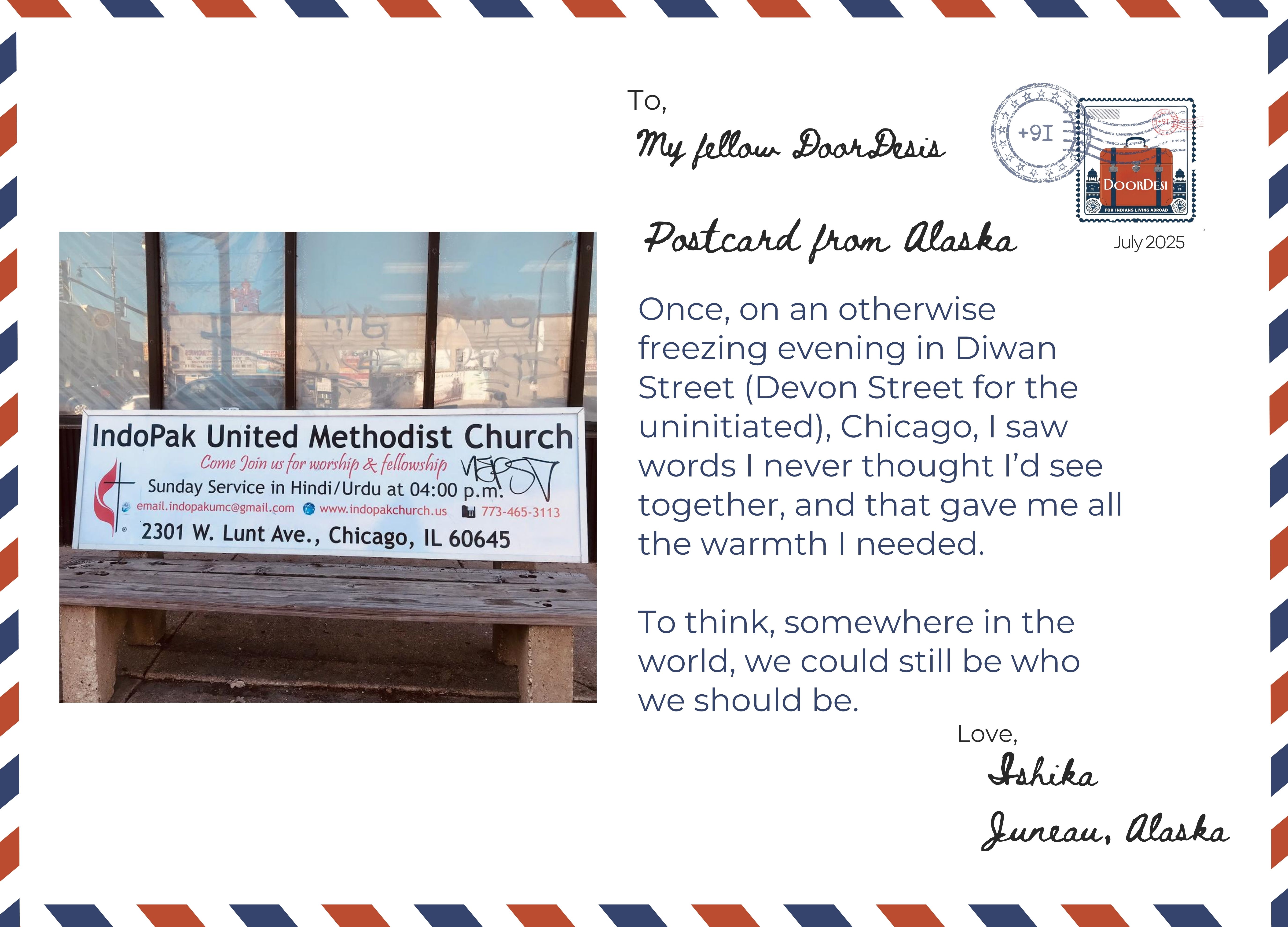 So we’re launching a new ‘Community Feature’: each week, one of you sends a postcard to the rest of us. A glimpse into your DoorDesi life, before we move on to bigger community plans.